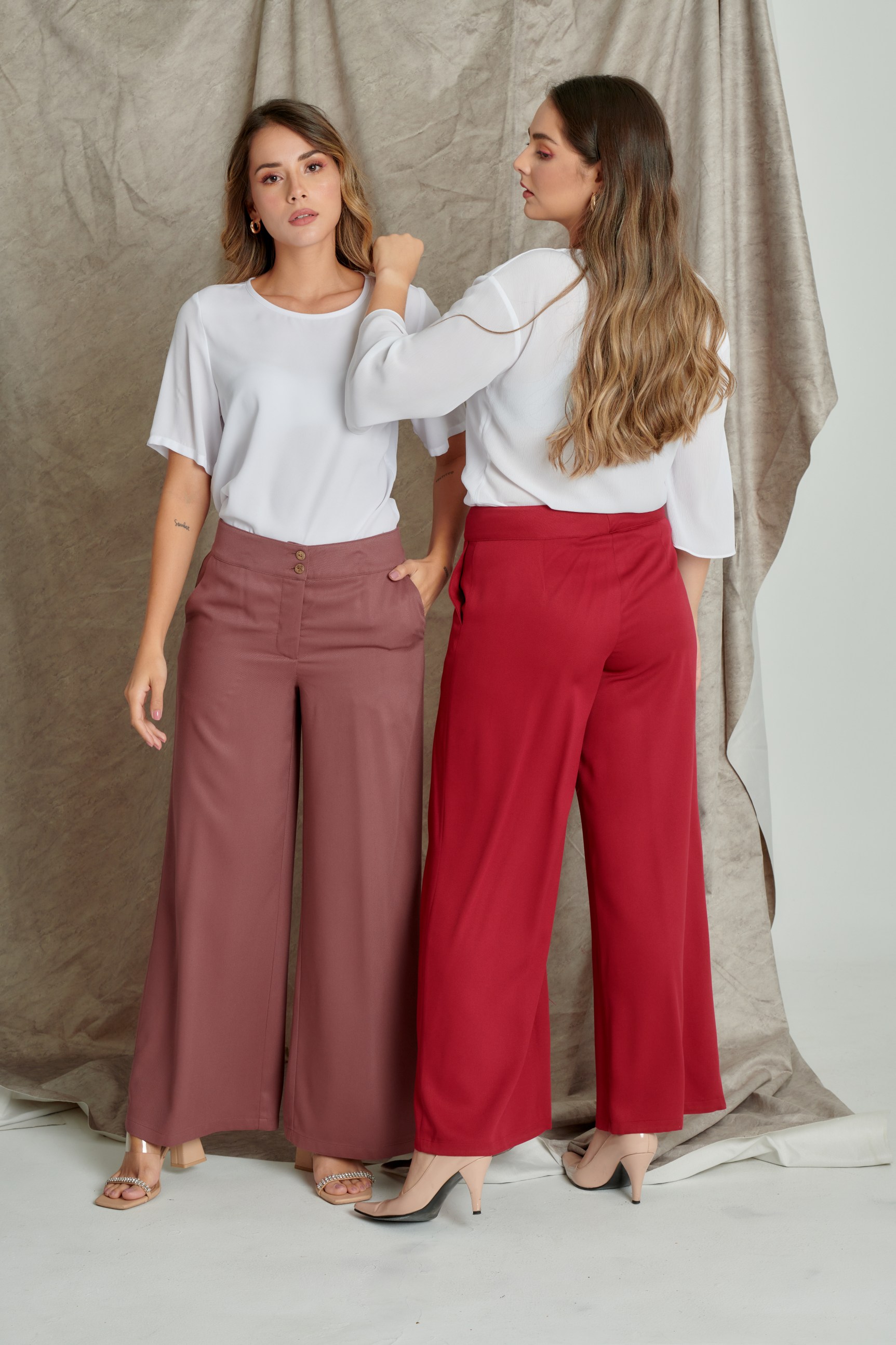 Pantalón en rayón, tiro alto con dos botones y bolsillos diagonales. Silueta recta y bota con amplitud.
