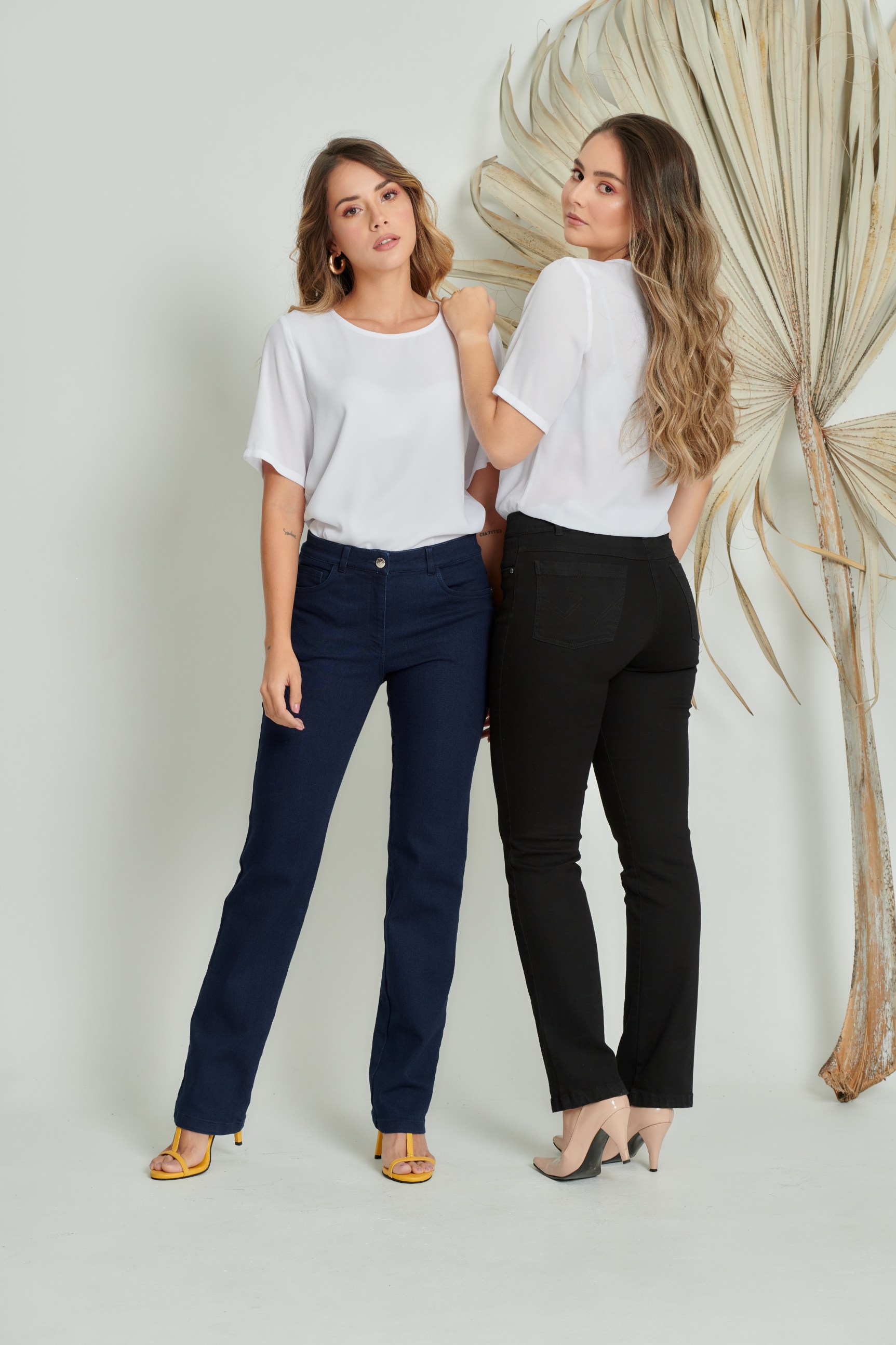 Pantalón clásico en denim, cinco bolsillos, bota recta, pretina anatómica y textura suavizada.