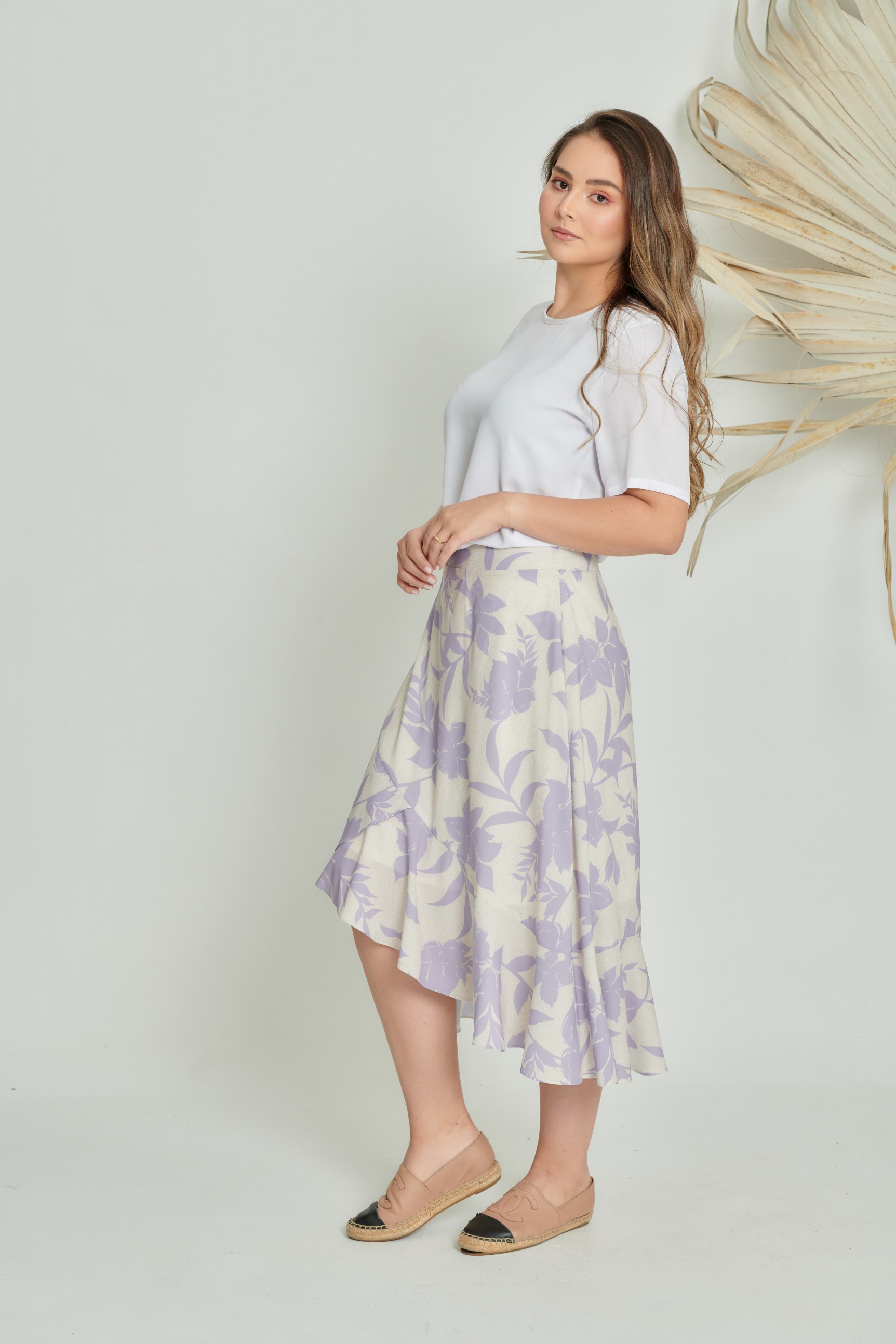 Falda en seda sublimada con diseño exclusivo "ramas", linea A, bolero leve en parte inferior de la prenda e irregularidad en parte inferior de la prenda.